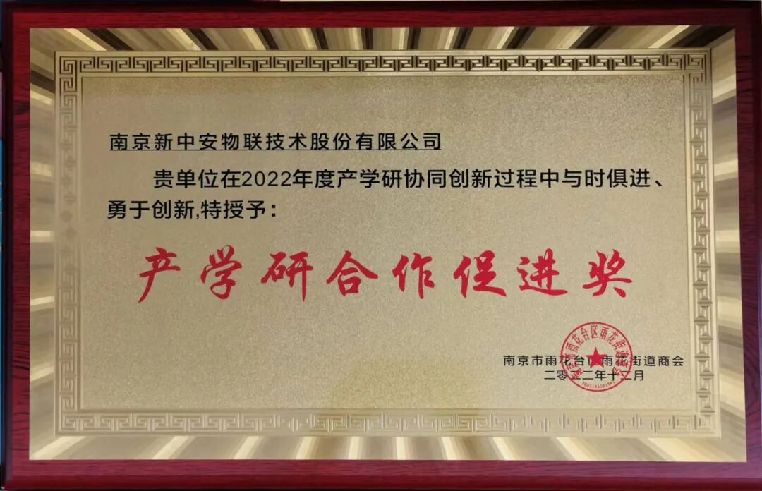 2023年1月8日下午,南京市雨花台区雨花街道商会迎新年会暨养乃世家品牌公益联谊晚宴在南京市梅花香里大酒店拉开帷幕。雨花街道商会企业家及各行业精英,欢聚一堂,回顾总结一年来商会取得的喜人成果,表彰先进,共计发展。会上,南京新中安物联技术股份有限公司荣获2022年度产学研合作促进奖。江苏省政协办公厅原副主任陈金龙、南京市......